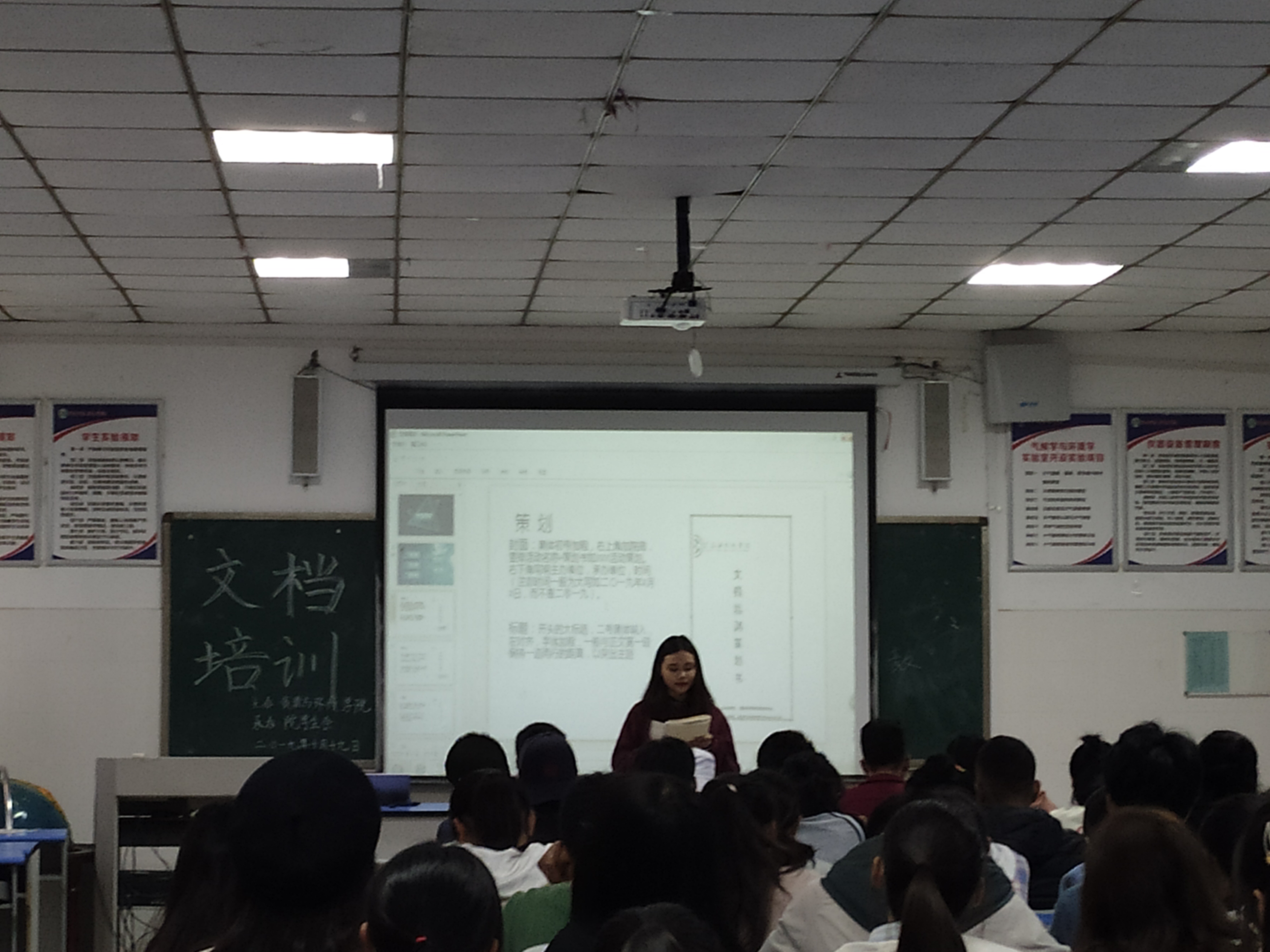 培训会伊始,由主持人闫佳丽上台介绍本次主要讲解人:学生会主席古春梅。古主席详细的讲解了策划书的格式,新闻的格式,总结的格式以及文件、字体等的正确使用以及注意事项。其次,还教了我们快捷键的使用,使我们以更快的速率处理好公务。
