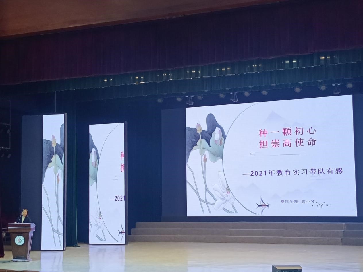 大会伊始,由侯雨乐老师做了学院2022届实习工作总结报告,随后由李俊陶、陶晓琴、高晨光、方立、廖宇浩等优秀实习生先后就自己的实习感悟分享了实习生报告,在汇报中诸位实习生代表分享了在实习期间有关学科教学、班主任工作、实习安排等方面的经验,重点强调备课的重要性。随后,由带队张小琴老师进行发言,谈到作为带队老师的感慨,对本届毕业生进行表扬。袁甲副处长对会议进行总结发言,并对明年的实习生寄予了殷切期望。最后由王波澜同学代表全体实习生向领导和带队老师表达谢意并宣布资源与环境学院实习生工作总结大会到此结束。