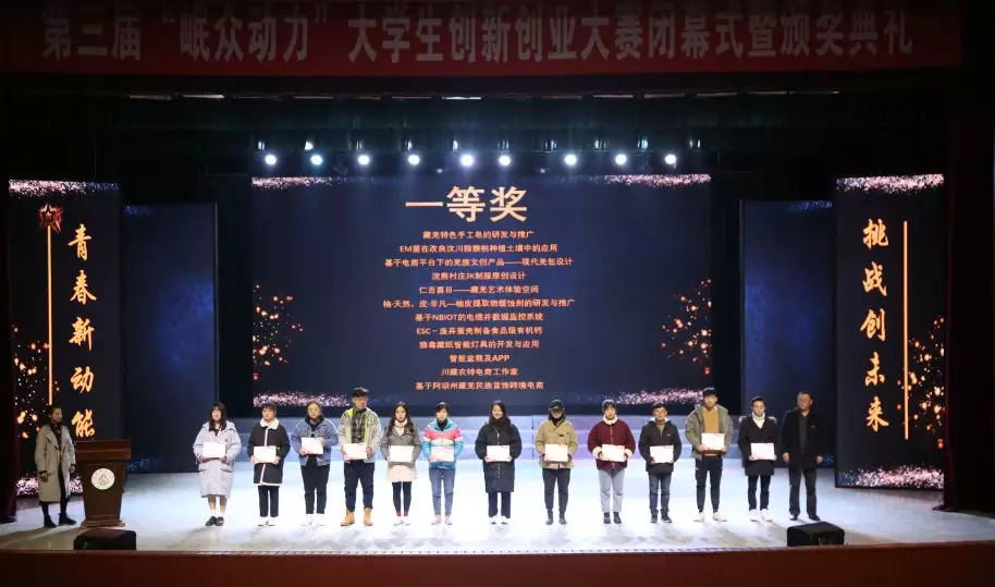 我校第三届“岷众动力”大学生创新创业大赛闭幕式暨颁奖典礼于2019年12月20日在南苑剧场成功举行。本次闭幕式暨颁奖典礼由张春梅老师主持。经创新创业评审专家组评定审核,本着公平,公正,公开的原则,产生了本次大赛的胜利者。项目总计有70项,其中一等奖5项、二等奖8项、三等奖12项、四等奖5项。资源与环境学院的创新创业项目也取得了优异的成绩。颁奖结束后,毛英教授指出:大学是人才的聚集地,而大学生不仅是一个精力充沛、思想活跃,富有创新精神的青年团体,也是推动社会创新创业发展的重要载体和不竭动力,他讲述了学校在创新创业大赛中取得的优异成果。然后代表学校向获奖的同学和老师表示了祝贺。