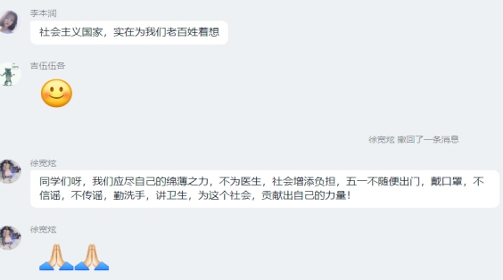 2020年4月29日—4月30日,资环学院各班团支部在钉钉群和QQ群组织开展了以“战“疫”中的中国制度和中国精神学习”为主题的学习活动。