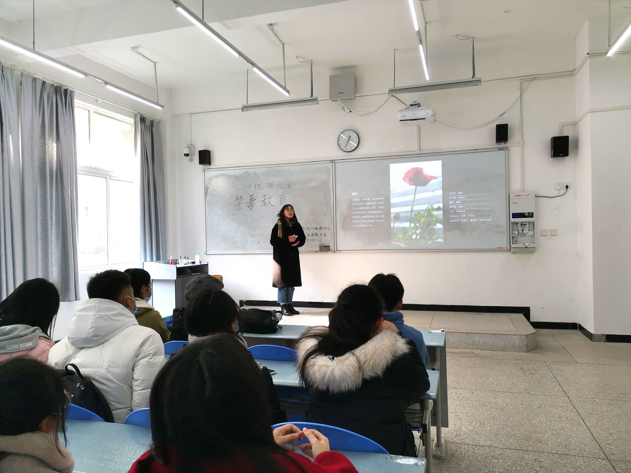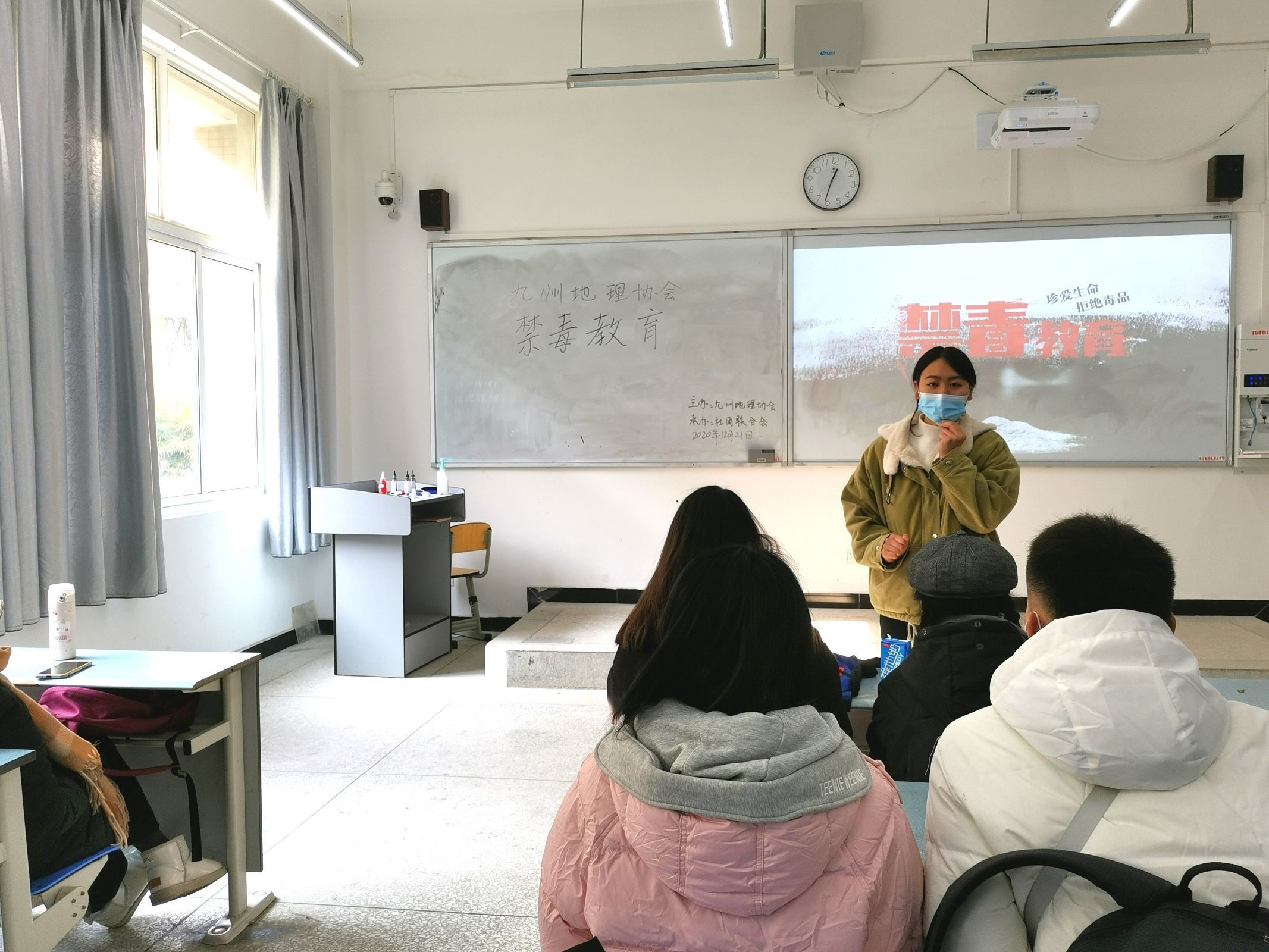 【本网讯】2020年12月21日中午12:30,由学生社团联合会主办,九州地理协会承办的九州地理协会禁毒教育在树人楼D101举行,参加本次活动的人员有会长许静华,副会长王波澜,付亚茹以及全体协会成员。由副会长担任主讲人。