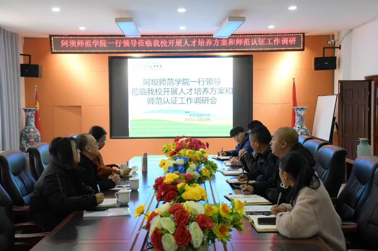 刘林一行与若尔盖县中学格日扎西书记、张建斌校长、化学组高强、岳小帆、向超、王俊杰等人进行了座谈,就师范认证、人才培养方案、中学化学教学现状、化学教师应具有的素质及双方深度交流合作等问题进行了交流探讨。座谈会上,格日扎西书记、张建斌校长详细介绍了学校基本情况,对我方与会代表提出的问题进行了现场解答并对未来双方深度交流合作提出了建议。